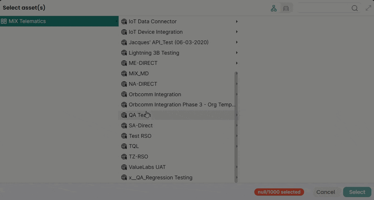 You can search for a group or asset in your organization when selecting through the organizational selector (Miller) columns.