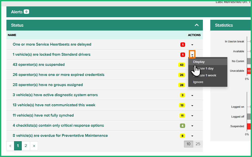 | Vehicles that are overdue for planned maintenance | Vehicles that have surpassed the planned maintenance intervals (meters or duration) configured in the assigned behavior profile. | A Maintenance operator must log into the vehicle and complete the planned maintenance question (assuming the vehicle maintenance has been completed). |
