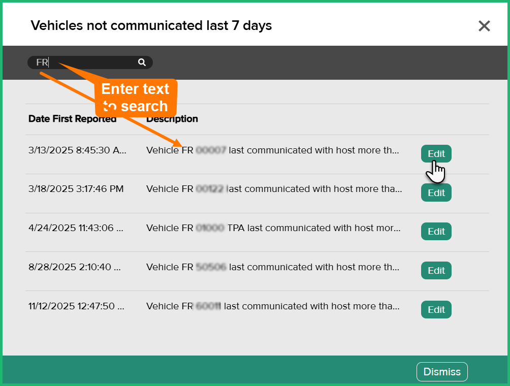 | Vehicles that have not communicated this week | Vehicles that have not successfully communicated with the software in the last 7 days. | An authorized user must find the vehicle, log in and check the wireless communication configuration to make sure it is compatible with the system settings. If it is configured correctly, the vehicle should be driven to a location with wireless coverage for communication with the software. |