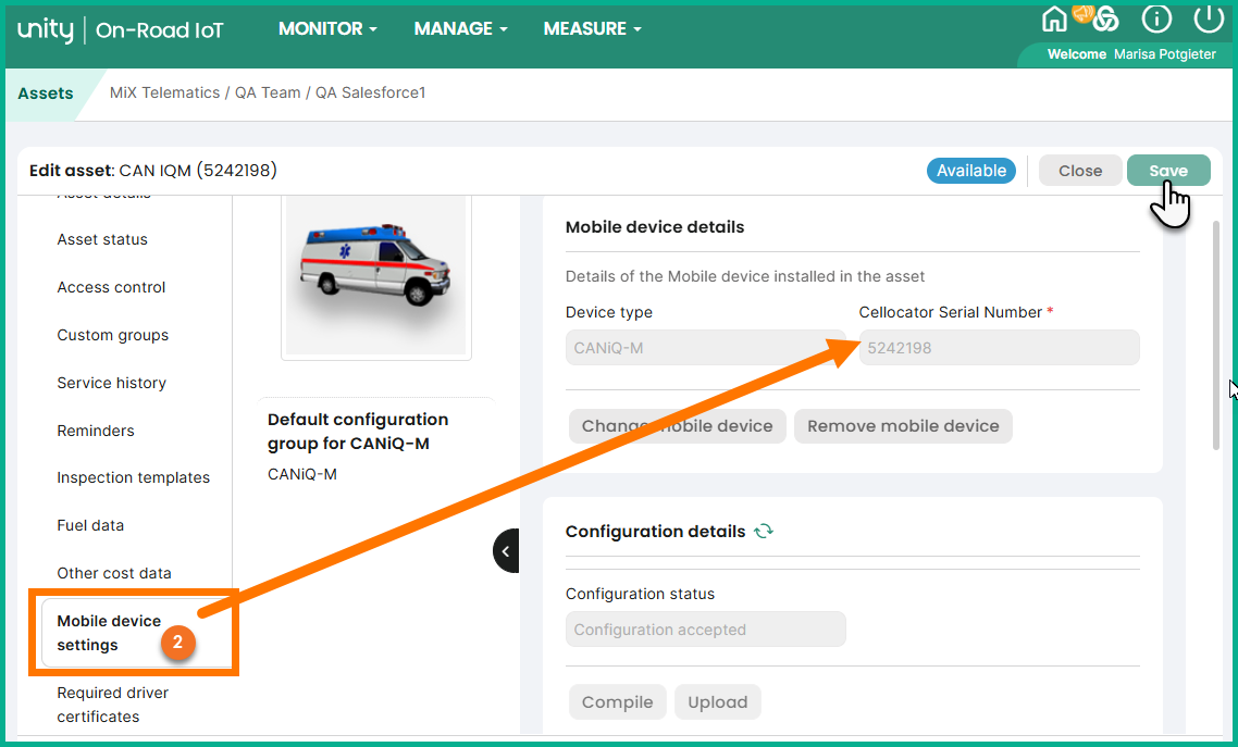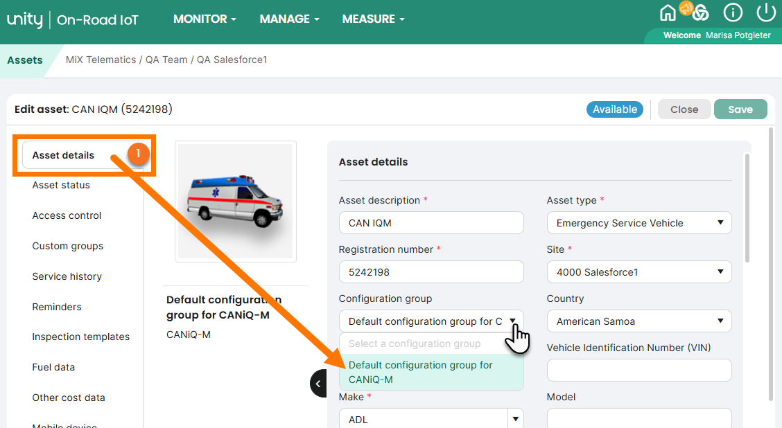 - On the Asset details tab, make sure the Configuration group is set to Default configuration group for the specific type of CANiQ device by selecting it from the list.