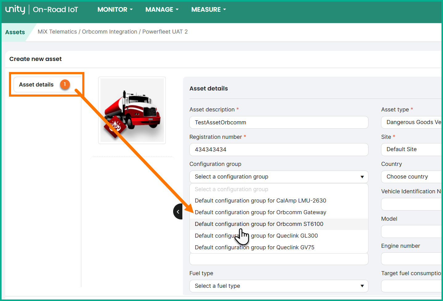 - On the Asset details tab, make sure the Configuration group is set to Default configuration group for the specific type of Orbcomm device by selecting it from the list.